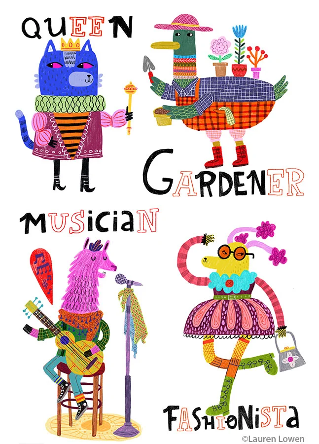 My characters have been used for stickers, activity books, editorial, greetings cards, and even children’s luggage! This one went to American Greetings.